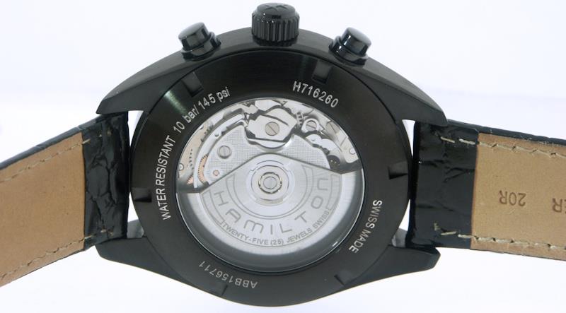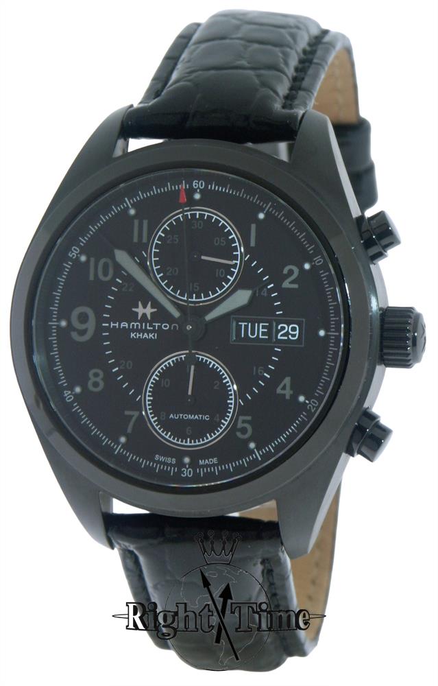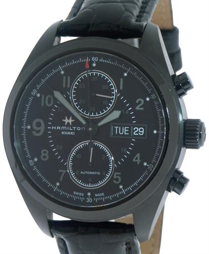 Hamilton Khaki Field model H71626735. Swiss made H-21 automatic chronograph movement with day/date function. Black PVD case. Blackout dial with Arabic printed numerals. Polished crocodile style strap. Sapphire crystal. Water resistant to 100 meters.