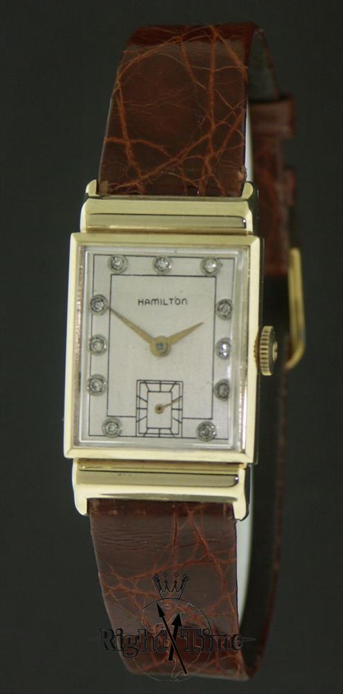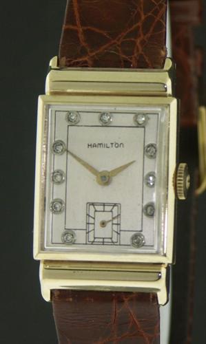 American Hamilton 14kt solid yellow gold case "Barton" hooded model with diamond markers silver satin dial on brown crocodile strap. Powered by 19 jewel Hamilton caliber 982 manual wind movement