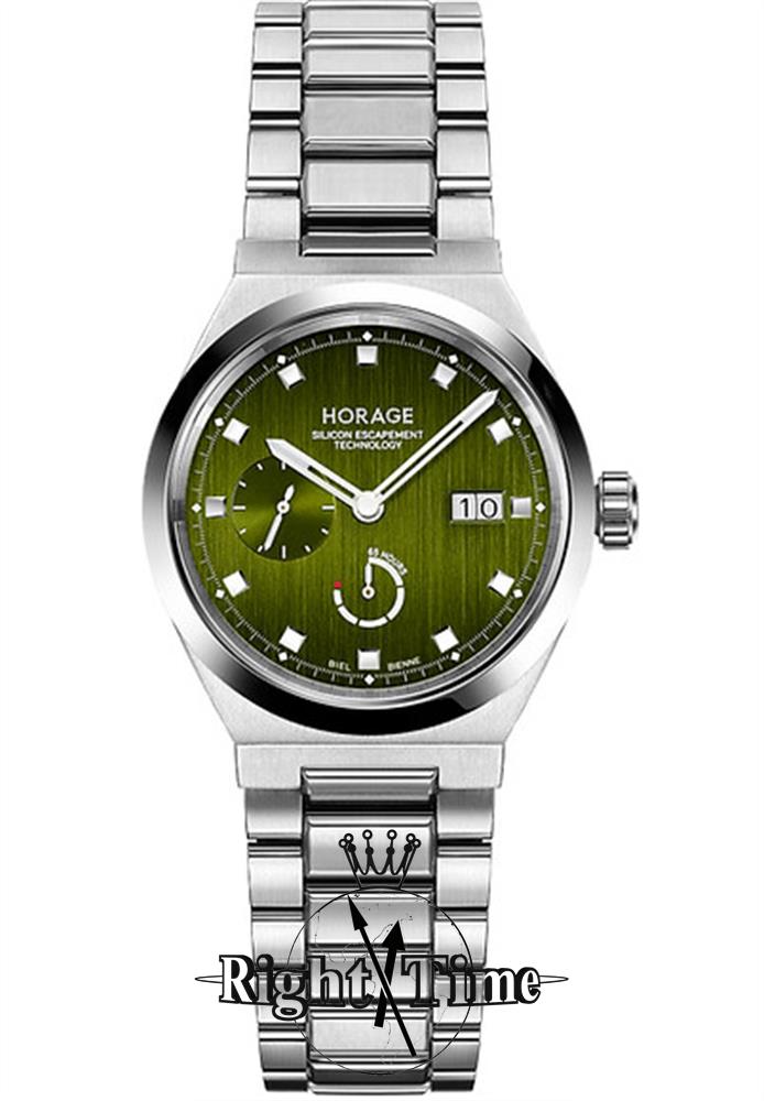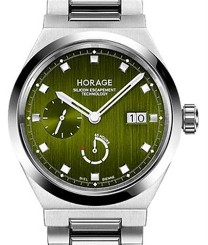 Horage Autark T5 model 004-TI-B-010. Grade 5 titanium case and bracelet. Brushed jura green color dial with steel tone hands and markers. Sapphire crystal with anti-glare treatment. Water resistant to 100 meters. Powered by the K1 automatic movement with 55 hour power reserve and silicone escapement technology.