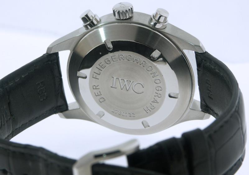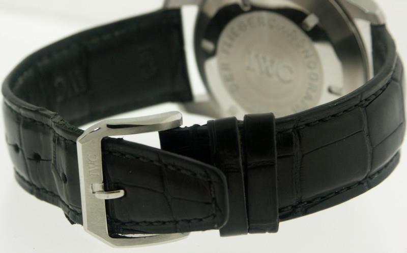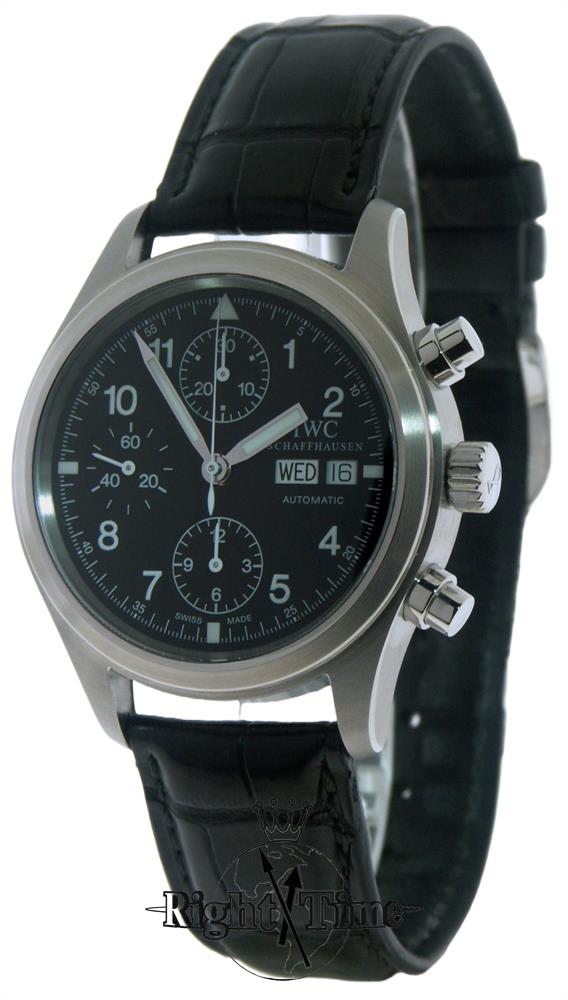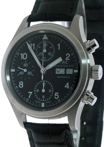 IWC Fliegerchronograph model 3706. Swiss made Valjoux 7750 automatic chronograph movement. Satin finished stainless steel case with a domed sapphire crystal. Black dial with luminous hands and hour markers. Black alligator leather strap. Water resistant to 60 meters.