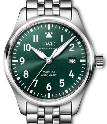 IWC Mark XX Pilot model IW328206. Swiss made Calibre 32111 automatic movement with 120 hour power reserve. Polished green dial with luminous hands and markers. Domed sapphire crystal with anti-reflective coating on both sides. Water resistant to 100 meters. Solid stainless steel case and bracelet with the IWC integrated EasX-CHANGE system.
