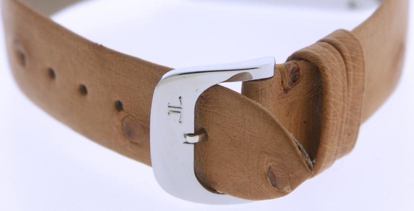 Jager-LeCoultre Swiss made quartz re-production circa 1990`s of the 1940`s Art Deco tank style moon phase model with pointer date function, featuring ivory lacquer dial dial printed, ostrich tan strap