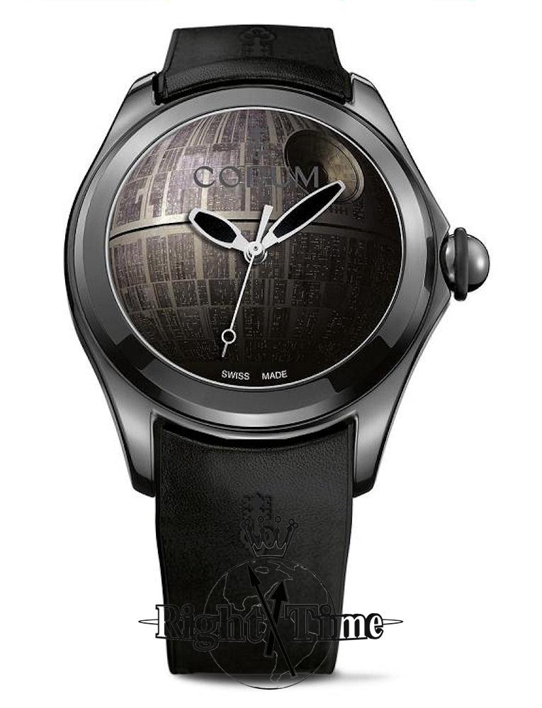 Corum Bubble Death Star Limited Edition model L082/02992. Powered by a Swiss-made automatic movement. Stainless steel case with black PVD coating. Patented Corum domed magnified sapphire crystal. Extremely intricate dial depicts the famed "Death Star" from the original Star Wars trilogy. Comes on a high grade black rubber strap.
