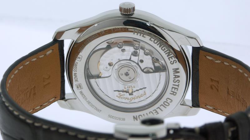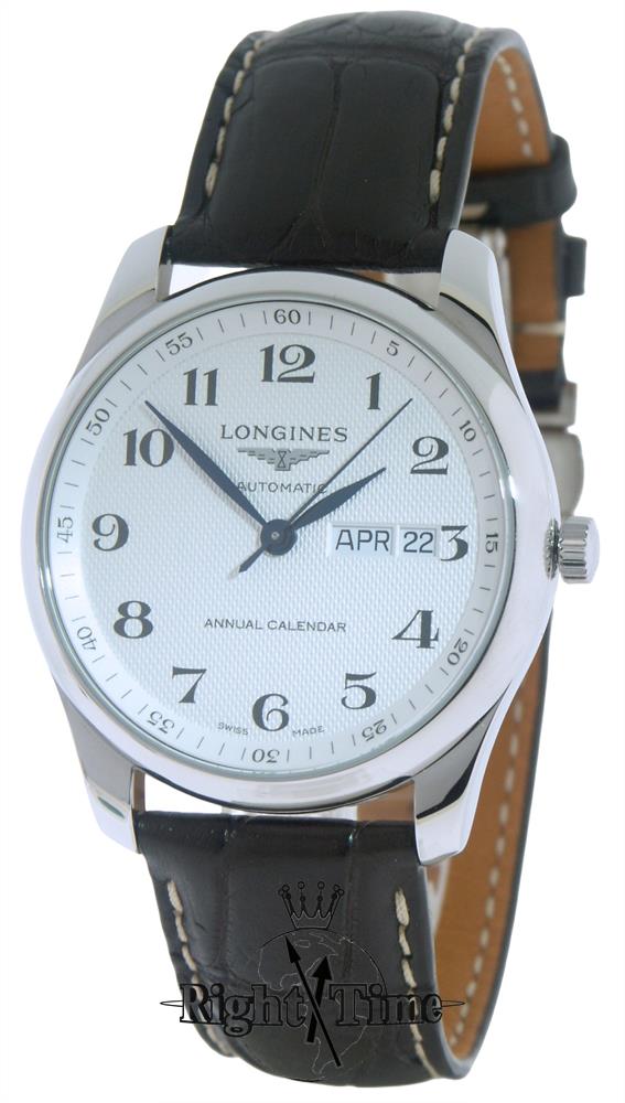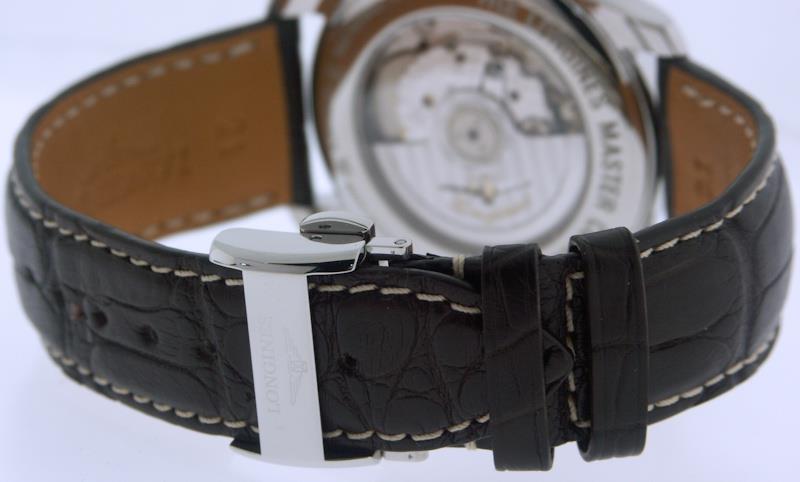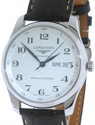 Longines Master Collection model L2.910.4.78.3. Swiss made Longines Caliber L897 automatic movement with annual calendar. Polished stainless steel case. Silver color Guilloche textured dial with large Arabic numerals and blued hands. Brown alligator leather watch band. Sapphire crystal.