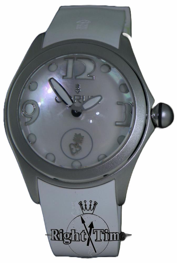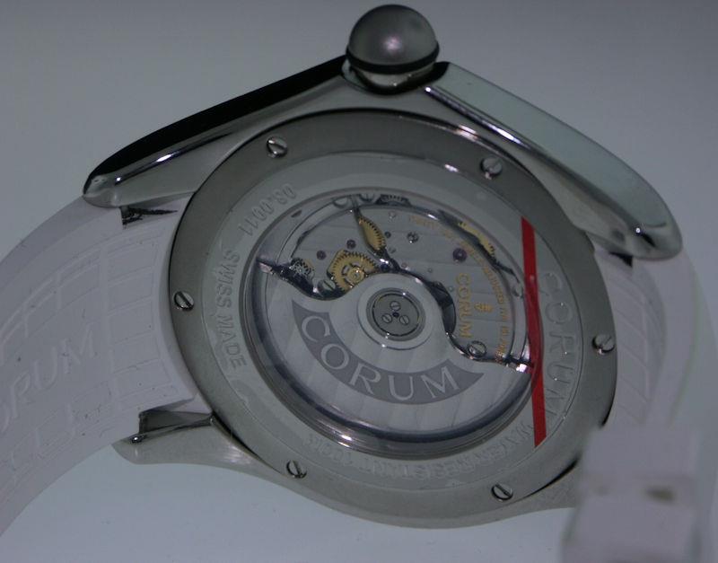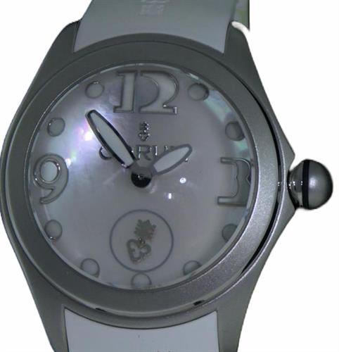 Corum Heritage Bubble Watch model L295/03049 powered by 30 jewels Swiss automatic Frederic Piguet Cal.1160 movement. Stainless steel 42mm case. Sapphire crystal on front and back. White Mother-of-Pearl dial with Arabic numerals, Super-Luminova coating, and small seconds sub-dial designed as a rotating key at 6 o`clock. White rubber strap. Water resistant to 100 meters