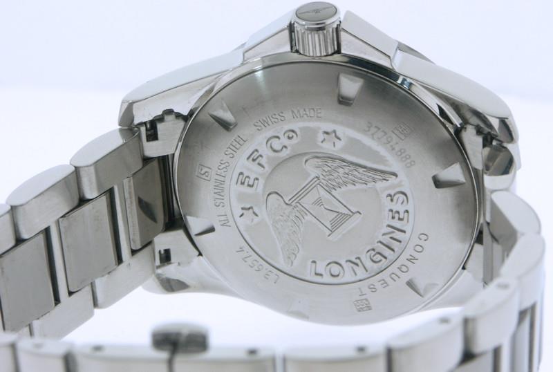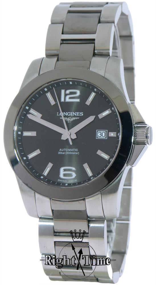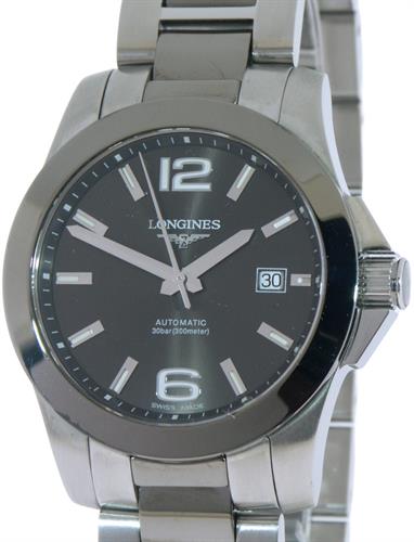 Longines Conquest model L3.657.4.06.7. Swiss made automatic movement. Stainless steel case with combination steel/ceramic bracelet. Ceramic fixed bezel. Grey dial with polished steel tone hands and markers. Sapphire crystal. Diver rated to 300 meters.