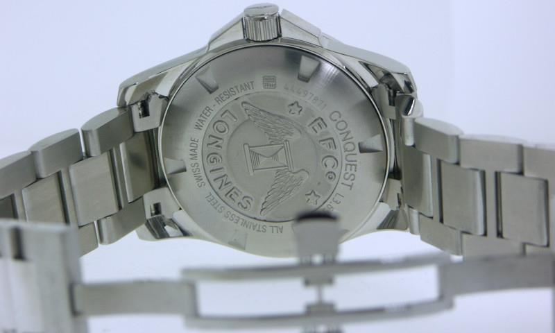 Longines Conquest model L3.659.4.76.6. Swiss made Longines Calibre L115 quartz analog movement. Solid stainless steel case and bracelet. Silver dial with steel tone hands and markers. Sapphire crystal. Water resistant to 300 meters.