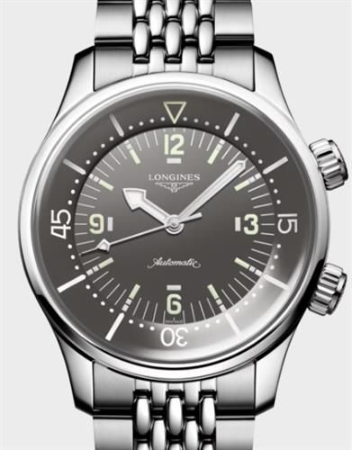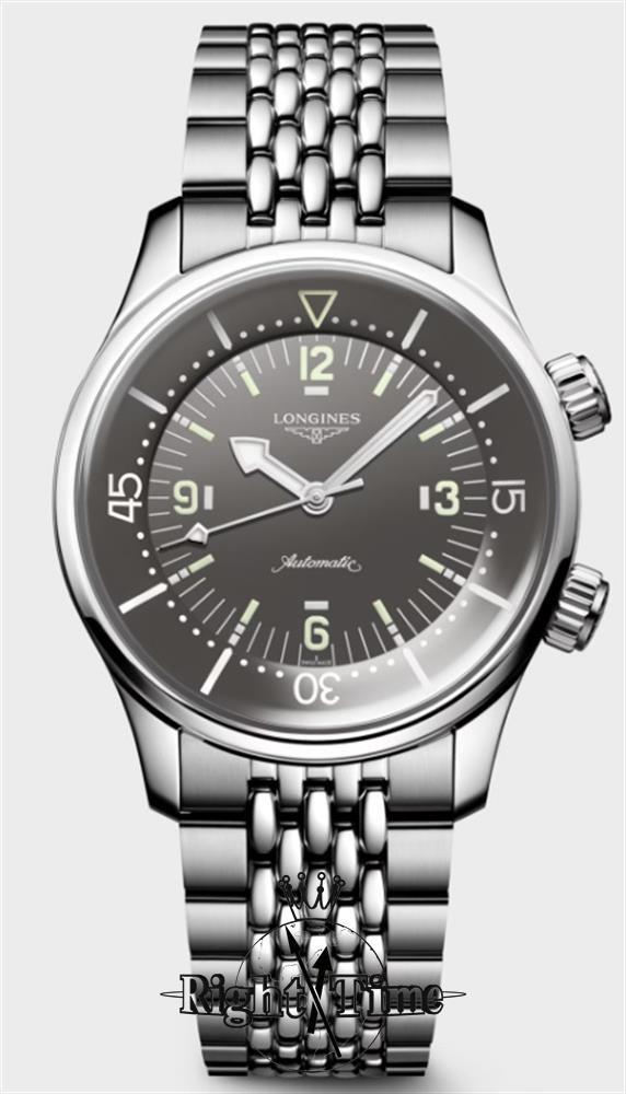 The Longines Legend Diver Watch model L3.764.4.99.6. This watch is a re-issue of a 1960 diving watch. Powered by an automatic movement Longines caliber L888 with 72 hours power reserve. Steel polished case with internal 0-60 bezel operated by separate crown at 2 o`clock position. Gray dial with luminous hands and markers. Stainless steel beads of rice bracelet.