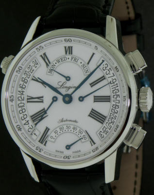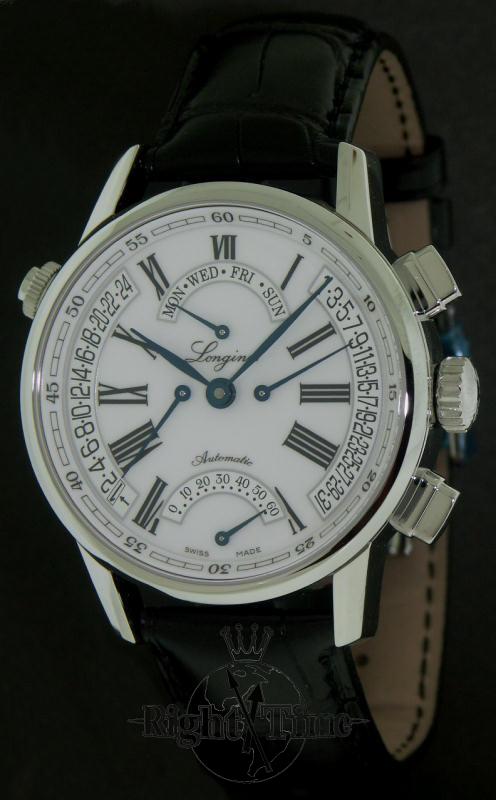 Self-winding mechanical watch from Longines Heritage Collection L4.797.4.71.2 featuring Longines proprietary Calibre L698.2 based on Valgrange A07. Four Retrograde complications: second hand, day and date pointer hands and 24-hour GMT hand. Stainless steel case. Sapphire crystal on front and case back. White porcelain style dial with extra large Roman numerals on black alligator strap