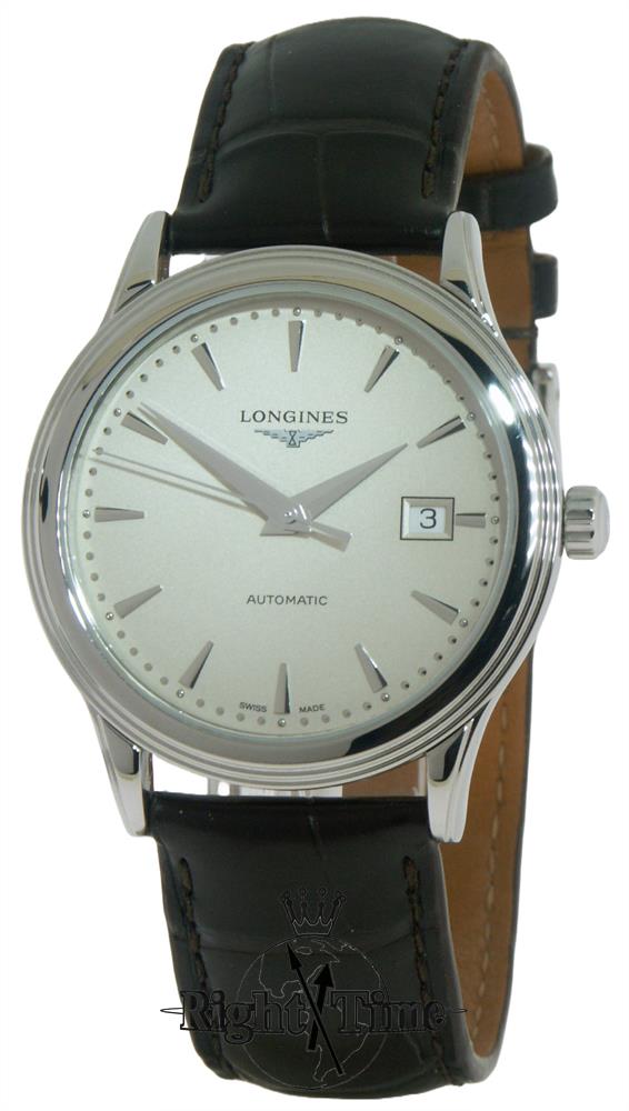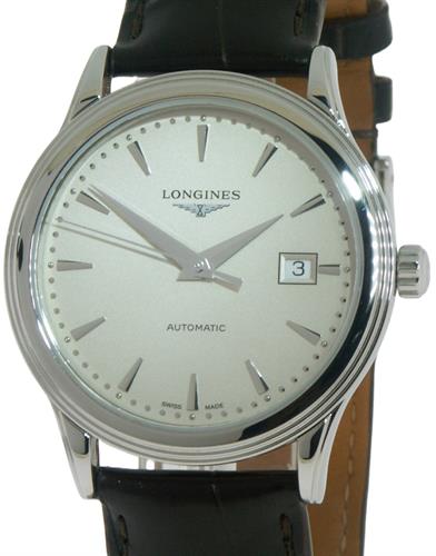 Longines Flagship model L49844792. Swiss made Longines Caliber L888 automatic movement with 72 hour power reserve. Polished stainless steel case. Beige dial with polished steel hands and markers. Sapphire crystal with layers of anti-reflective coating on the underside. Brown alligator strap.