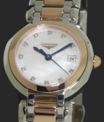 Longines elegant "Prima Luna" collection, with large, yet comfortable bracelet links, wrist hugging curved case and sapphire crystal, mother-of-pearl diamond studded dial with contrasting blued hands, solid 18kt rose gold and steel case and bracelet