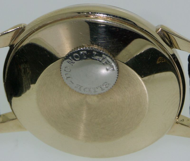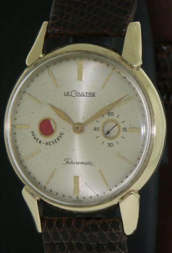 14kt solid yellow gold case LeCoultre "Futurematic" cal 817. This is the rarer porthole design and is much more uncommon than the earlier calibre 497 version which featured regular sub-dials and small hands. This version features small `portholes`: power reserve changing color disc at 9 o`clock (Reserve de Marche) and seconds disc at 3 o`clock.