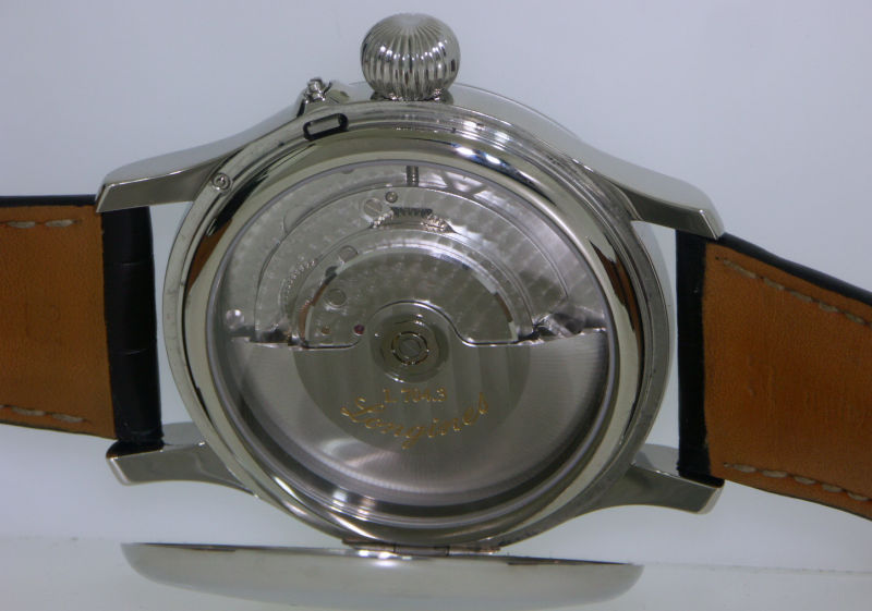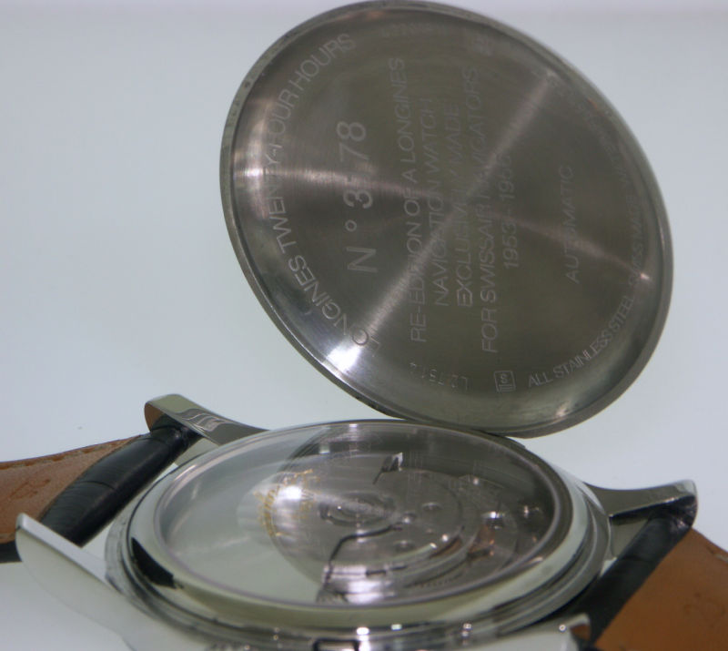 Longines "Heritage Twenty-Four Hours" re-issue of the famous Navigation pilot model made exclusively for SwissAir navigators 1953-1956. Highly polished 47mm stainless steel case with hinged caseback operated by push button at 4 and revealing the beautiful ETA Valgranges movement