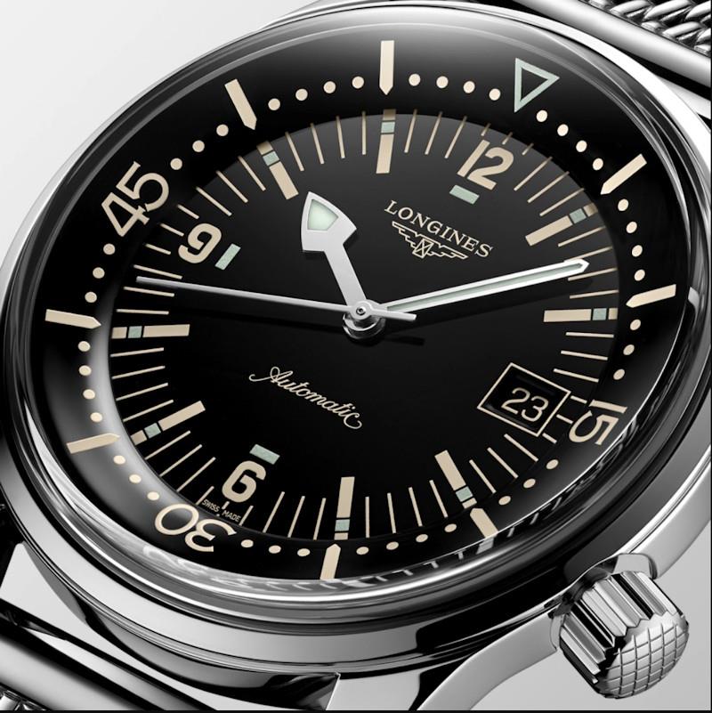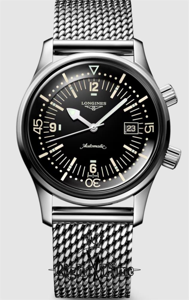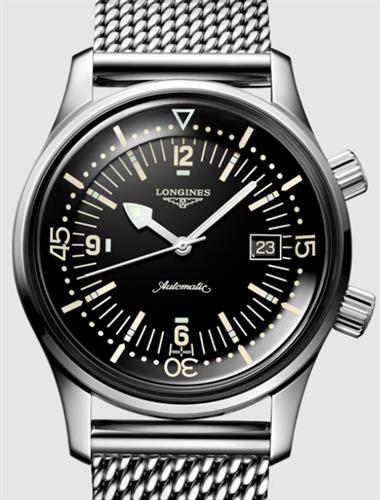 Longines `Legend Diver` automatic model L3.774.4.50.6 housed in 42mm polished stainless steel case and mesh factory bracelet, powered by Longines Calibre L888 movement with 72 hour power reserve