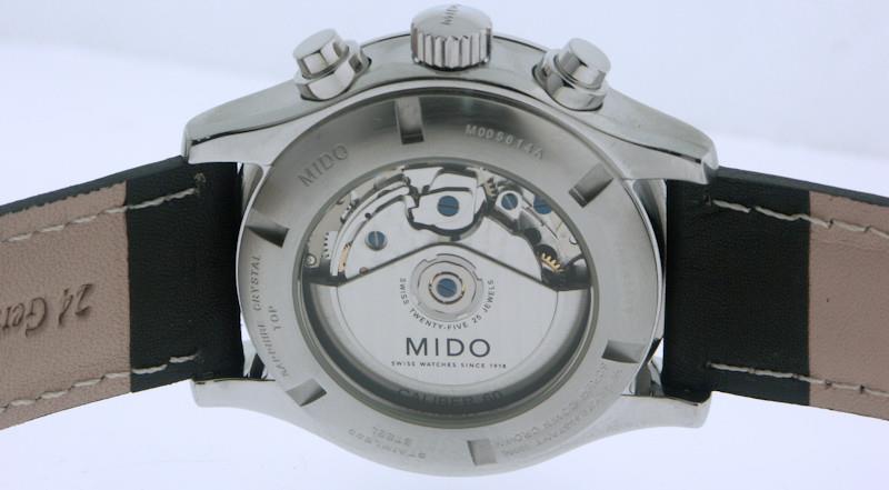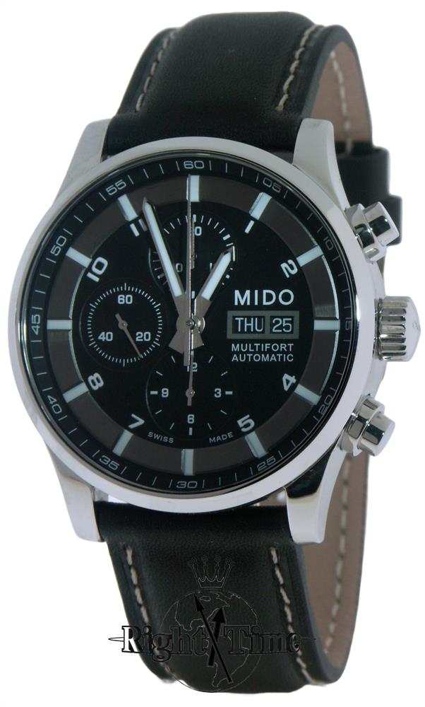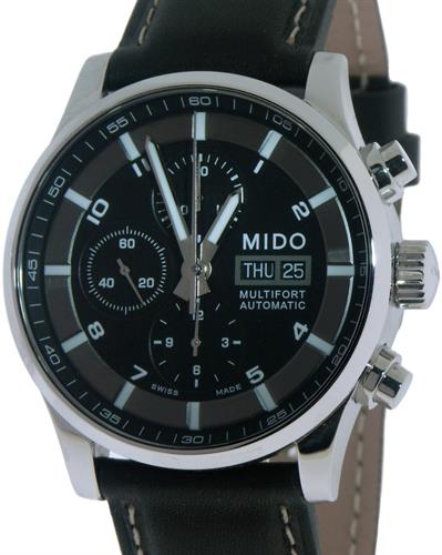 Mido Multifort collection. Model M005.614.16.057.21A. Swiss ETA/VALJOUX 7750 base Caliber 60 automatic chronograph movement with day/date calendars. Stainless steel case with black leather strap. Black textured dial with luminous markers