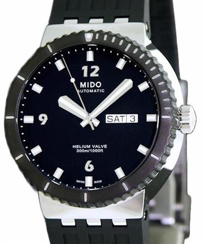 Mido All Dial Diver collection. Model M0066301705722, water resistant to 300 meters. Swiss ETA 2836-2 automatic movement with day/date calendars. Polished stainless steel 44mm case with helium escape valve on black rubber sport band. Black pvd bezel. Sapphire crystal with extremely strong double anti-glare coating, making dial easy to read at any angle.