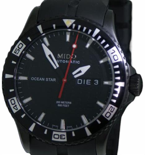 Mido Ocean Star Captain IV M011.430.37.051.22 watch. Black PVD coated stainless steel case with uni-directional rotating bezel. Observation case-back. Swiss ETA 2836 automatic movement with day/date function. Black textured dial. Black genuine rubber strap. Water resistant to 200 meters