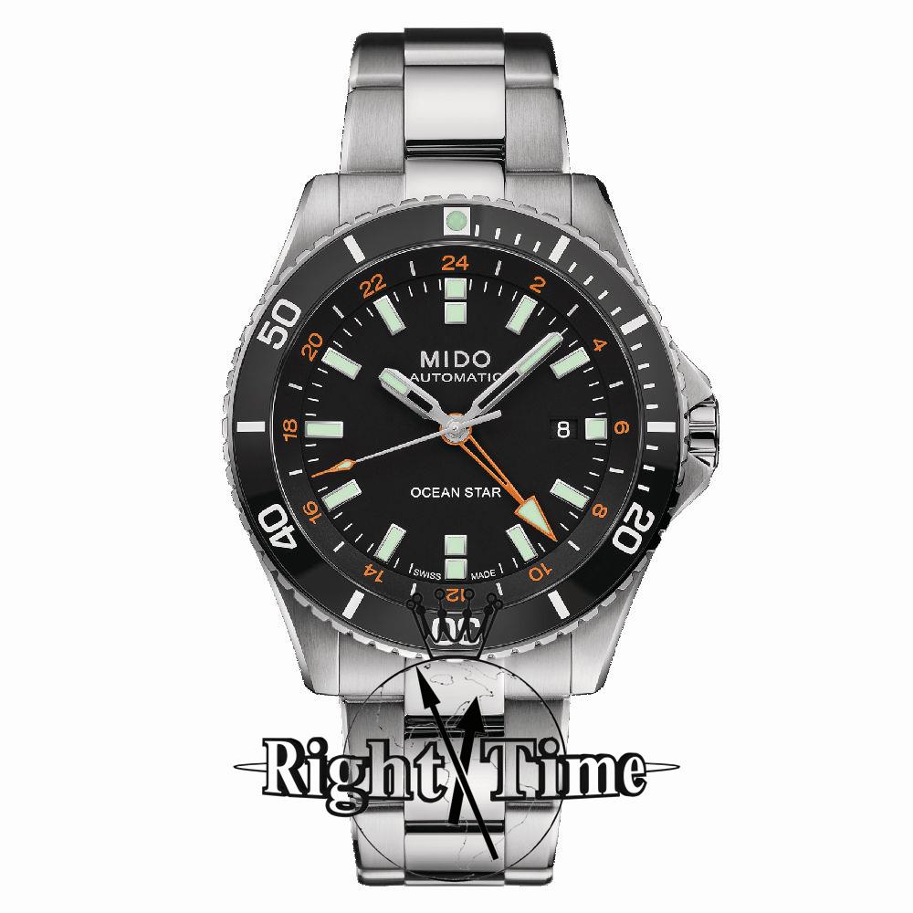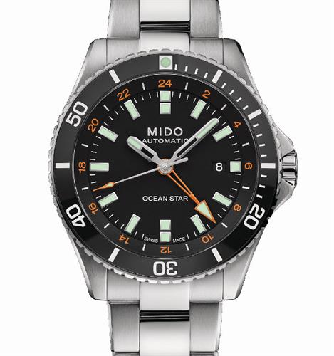Mido Ocean Star GMT, factory model M026.629.11.051.01. Powered by a Mido Caliber 80 (base ETA C07.661) automatic movement. Water-resistant to 20 bar (200 m / 660 ft). Stainless steel case and bracelet, black uni-directional bezel, and black dial with luminous markers.