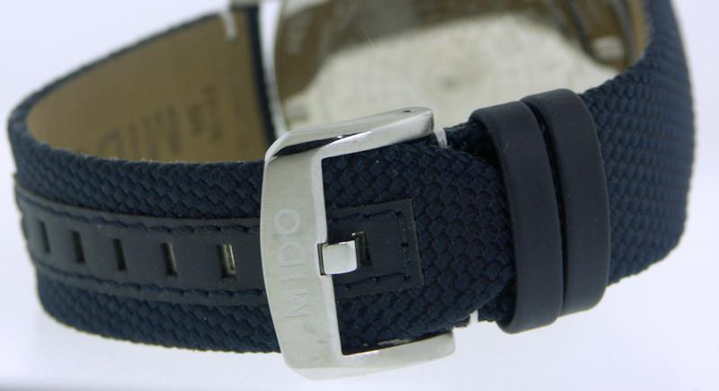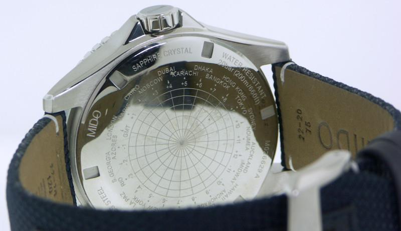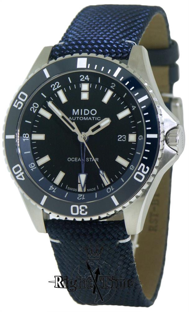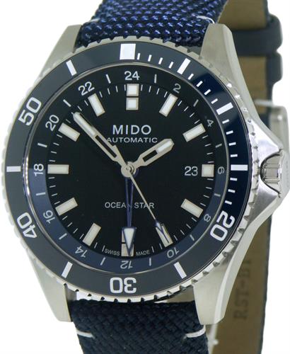 Mido Ocean Star GMT, factory model M026.629.17.051.00. Powered by a Mido Caliber 80 (base ETA C07.661) automatic movement. Water-resistant to 20 bar (200 m / 660 ft). Stainless steel case with embossed calf leather/synthetic strap, blue uni-directional bezel, and black dial with luminous markers.