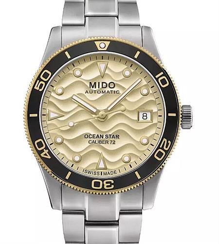 Mido Ocean Star 39, factory model M026.907.21.021.00. Powered by a Mido Caliber 72 automatic movement. Water-resistant to 20 bar (200 m / 660 ft). Stainless steel case, black and gold plated uni-directional bezel. Wave textured champagne dial with luminous markers and date calendar.