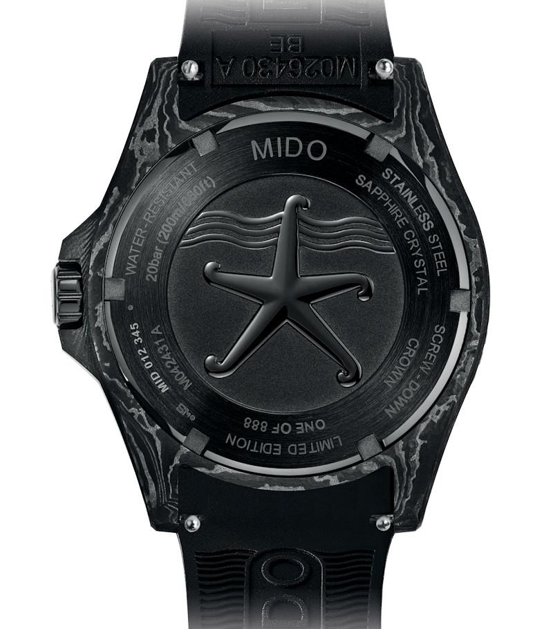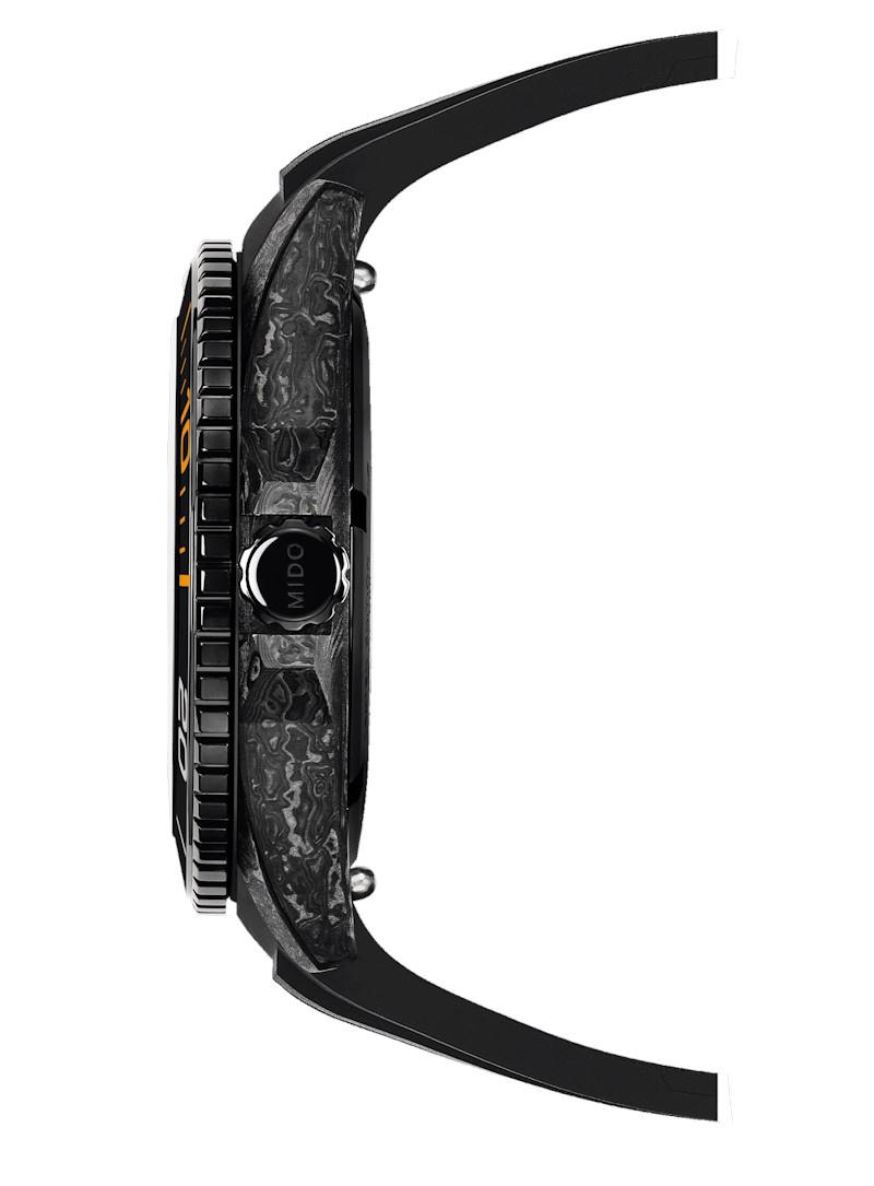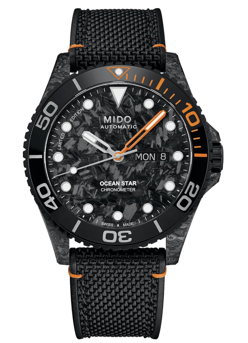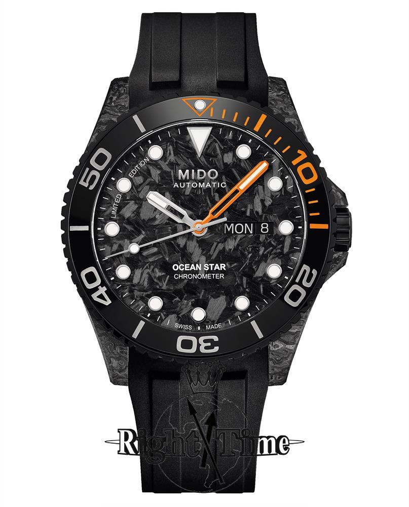 Mido OceanStar 200C model M042.431.77.081.00. Limited Edition of 888 pieces. Swiss made Mido Caliber 80 automatic movement with 80 hour power reserve. COSC certified chronometer. The case is made of high-strength carbon which provides a unique texture and design. Uni-directional bezel with 60 minute ceramic insert. Stunning carbon textured dial with luminous hands and markers. Anti-glare treated sapphire crystal. This Limited Edition beauty comes in a set with both black rubber, and black textile straps. Water resistant to 200 meters.