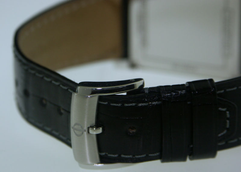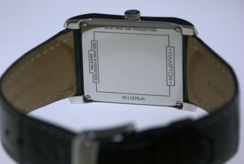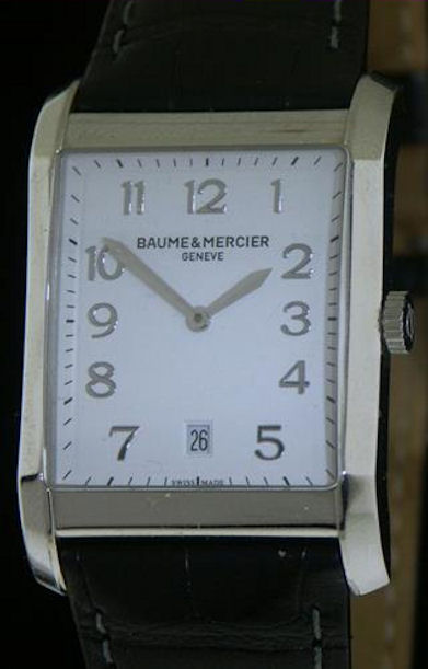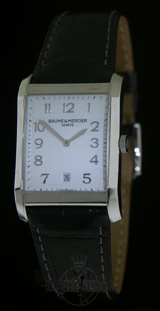 Baume & Mercier Hampton model M0A10154. Swiss Quartz analog movement. High polish stainless steel case with curved sapphire crystal. White dial with steel tone Arabic numerals and hands. Black leather strap with alligator grain.