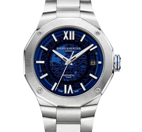 Baume & Mercier Riviera model 10616. Powered by Baumatic manufacture calibre movement. Comes in a 42mm stainless steel case with bracelet and dodecagonal bezel. Sapphire blue dial with Roman numerals and date calendar. Water resistant to 100 meters