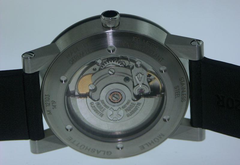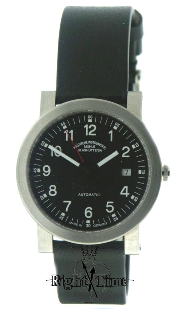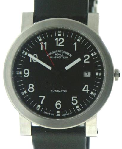 Muhle Glashutte "Architectura" model M1-21-03/1 from Muhle Glashutte Design Line. Swiss Automatic movement with unique modifications. Satin finish Stainless steel case with observation case back, black leather watch band and black dial with date calendar, luminous Arabic numerals and hands