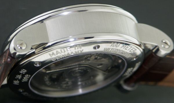 Muhle Glashutte wrist watch model M1-30-95LB from Muhle Glashutte Teutonia Collection. Powered by ETA 7750 movement. Stainless steel 316L case with observation case back, black leather watch band and silver guilloche textured dial with polished indexes