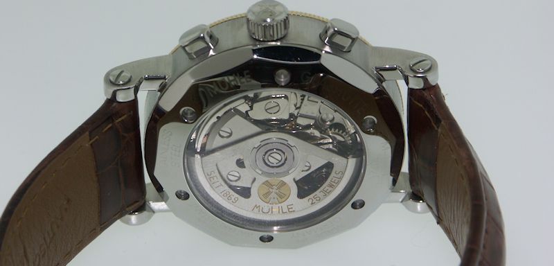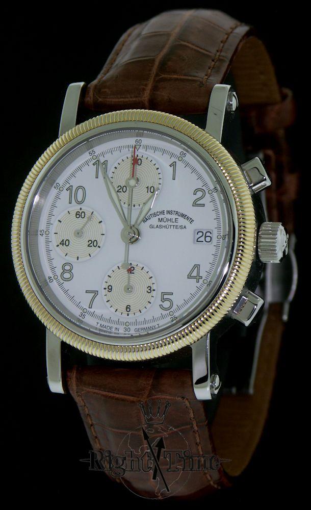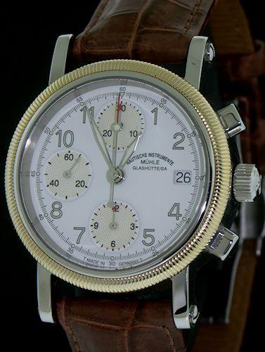 Muhle Glashutte Chronograph II watch model M1-31-51lb from Muhle Glashutte Classic-Line series. Swiss ETA/VALJOUX Cal. 7750 25 jewels Automatic chronograph movement, stainless steel case with 10 micron gold plated coin edge bezel, white dial with Arabic numerals and date calendar, genuine alligator strap with deployant buckle.