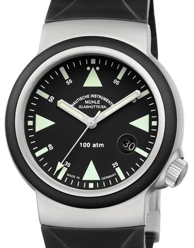 Best selling model of Natusche Instrumente from Muhle Glashutte SA made in collaboration with Search and Rescue captains. Powered by Sellita SW200 26 jewels Swiss Automatic movement with Date calendar. Easy to read flat black dial with extra large luminous markers and extra large luminous hands. Very comfortable and flexible rubber strap with steel sport buckle.