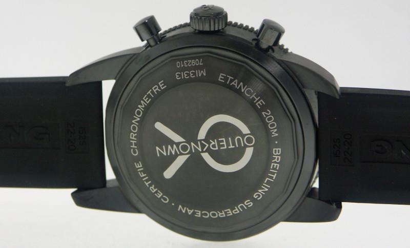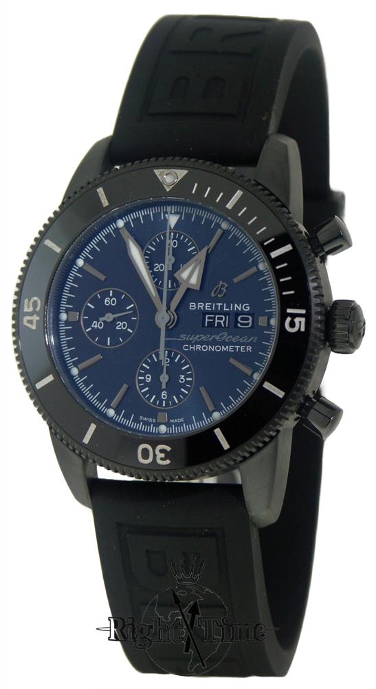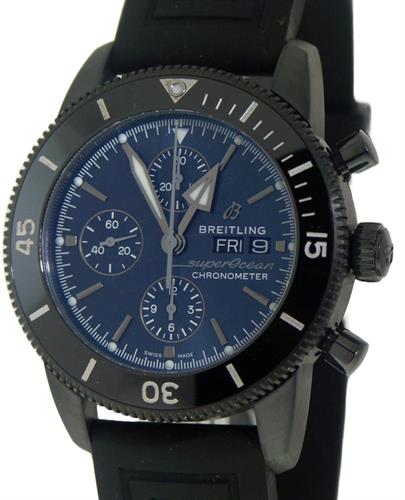 Breitling Outerknown Superocean Heritage Automatic Chronograph. Swiss made automatic Breitling Caliber 13 movement, based on ETA7750. Polished stainless steel case on black rubber strap. Blue dial with dark steel tone hands and markers. Uni-directional bezel with blue 60 minute insert. Sapphire crystal. Water resistant to 200 meters.