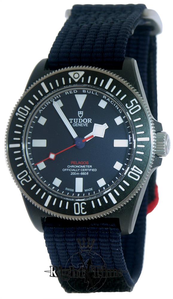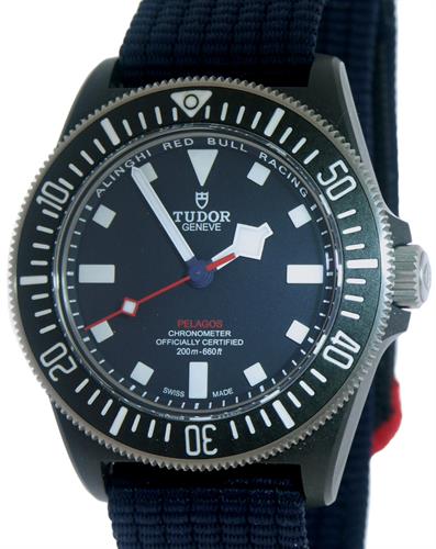 Tudor Pelagos FXD 43mm model M25807KN-0001. Alinghi Red Bull Racing Special Edition. Powered by Tudor Manufacture Calibre MT5602 chronometer automatic movement. Black carbon composite case and bezel insert. Blue dial with luminous hands and markers. Blue/red fabric/velcro one piece strap.