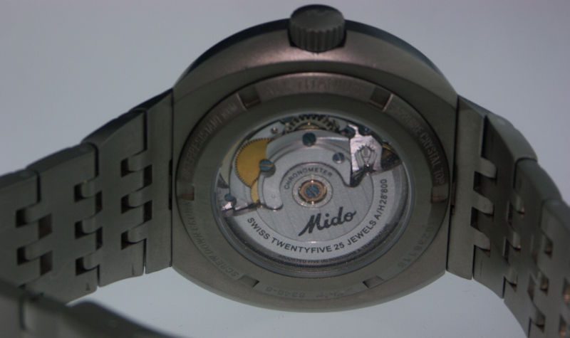 Mido All Dial collection. Model M8340.8.D8.11. Swiss ETA 2836-2 automatic movement with day/date calendars. Satin finished titanium case and watch bracelet. Black textured dial with orange markers.