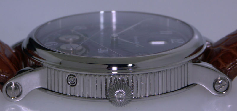 Debut complication of Sunrise/Sunset first created by young german watchmaker Martin Braun in 2000 and later becoming his signature, named after Greek Goddess of dawn - Eos. Polished stainless steel case with large vertical coin edge style 43mm case shows beautifully this blue sun rays guilloche pattern dial intermixing with machining cams of the indicators on tan alligator strap.
