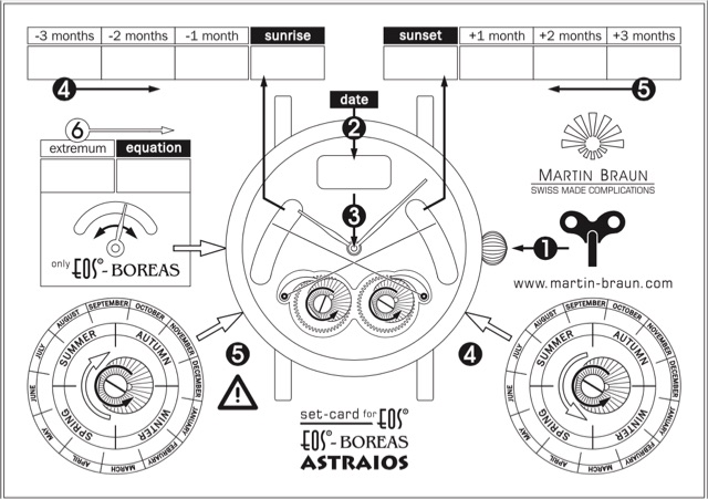 Martin Braun, Pforzheim trained German master watchmaker created this new and innovative complication that indicates the local time of sunrise and sunset with with long hands positioned at 5 and 7 in the early 2000's and named it after Eos the Greek goddess of the dawn. In 2007 Martin Braun brand became part of the Franck Muller Watchland group and in 2009 left the company to create another brand in 2011 Antoine Martin.