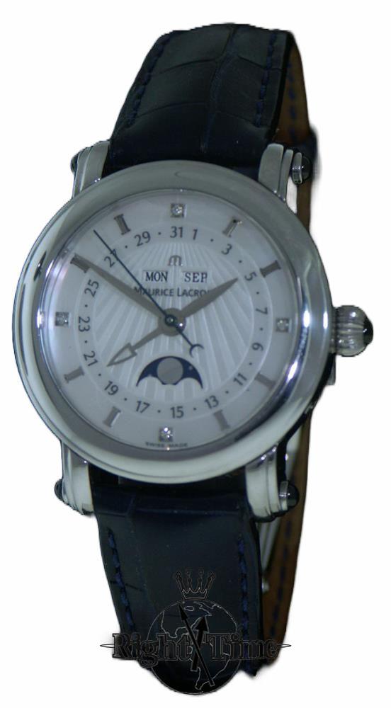 Maurice Lacroix Masterpiece Phase De Lune MP6066 automatic 35mm polished stainless steel case, mother-of-pearl dial with 4 diamonds, pointer date indicator, moon phase disc, month and day windows