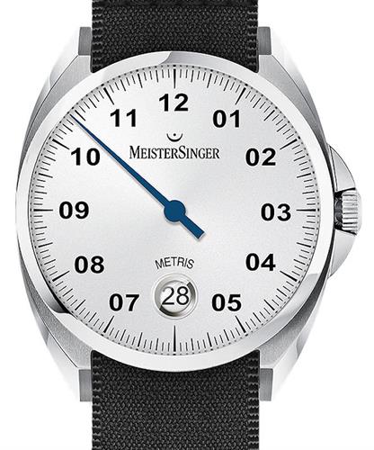 MeisterSinger "Metris" single hand model with opaline silver dial. Powered by automatic ETA 2824-2 movement inside of polished and satin finished 38mm stainless steel case