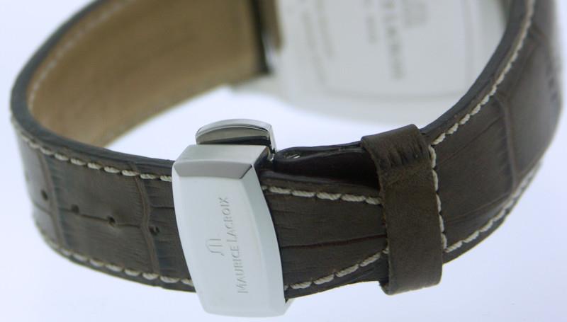 Maurice Lacroix Miros Coussin Reveil model MI5027. Solid stainless steel case. Black dial with Roman printed numerals. Swiss quartz analog movement with big date, and alarm function. Domed sapphire crystal. Brown leather strap with white stitch.
