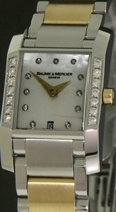 Spectacular, elegant everyday, yet dressy, "Diamont" ladies model from the famous Swiss watchmaker - Baume & Mercier. Combination of brushed and polished stainless steel and 18kt gold and adorned with 14 diamonds on the side of the 22mm polished curved case. Ultra modern and tough, yet with a profile of the Gruen or Elgin case style of the 1930`s