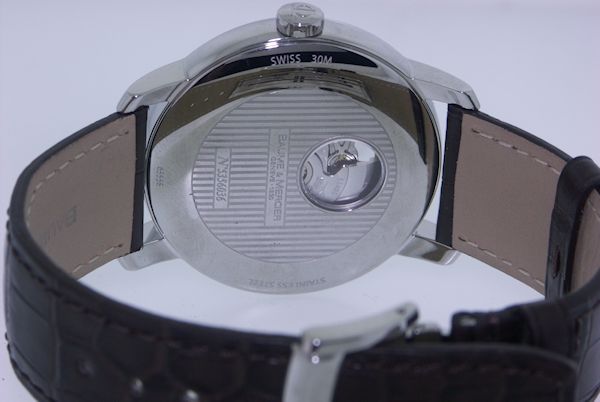 Baume and Mercier Classima Executive Mens XL automatic watch. Handsome 42mm highly polished case with black pinstripe dial. Beautiful center guilloche texture leading up to an open heart where the balance of the movement can be seen. blued hands and a genuine black alligator strap finish off this stunning piece.