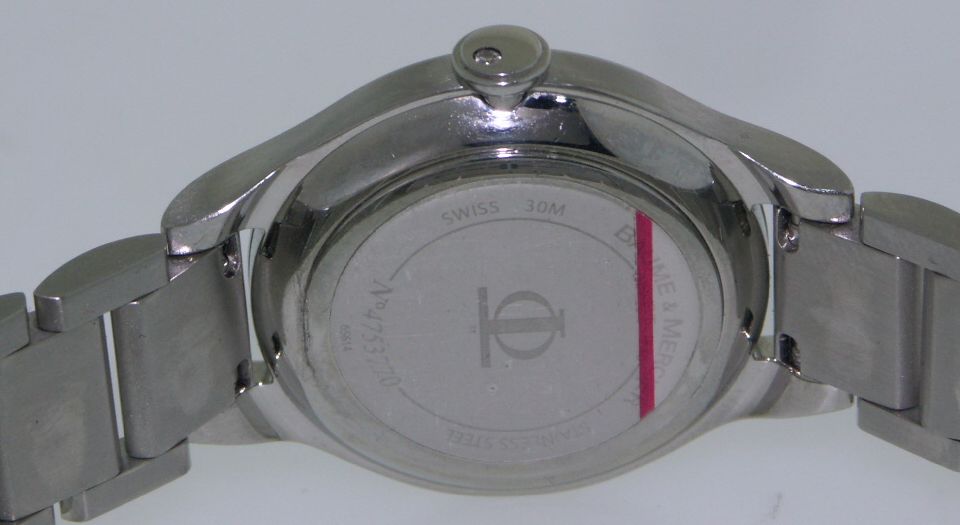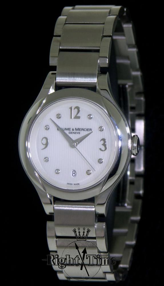 Ladies Baume et Mercier MOA08769 "Ilea" stainless steel quartz model on bracelet. White Mother-of-Pearl dial with diamond markers and date calendar. Crown with diamond set inside.