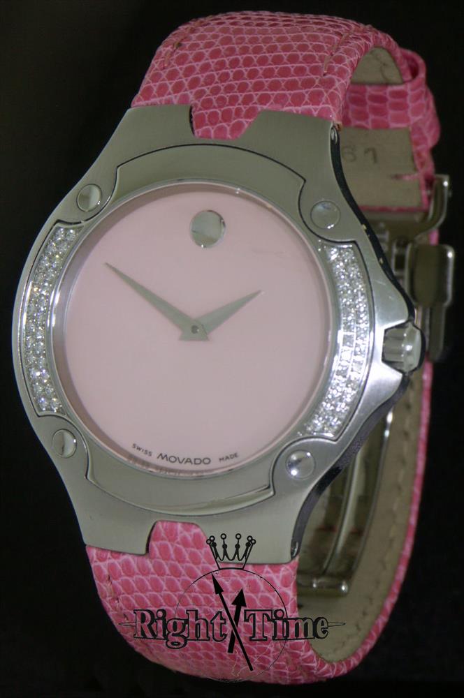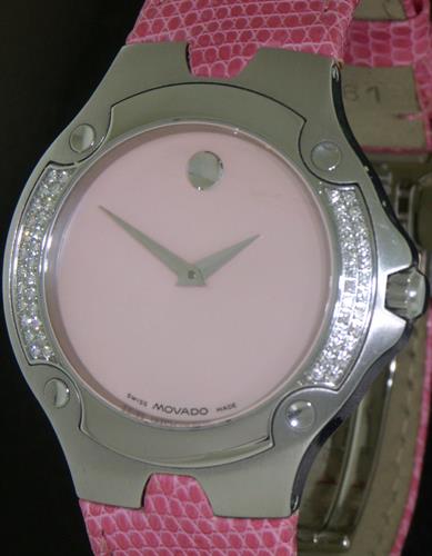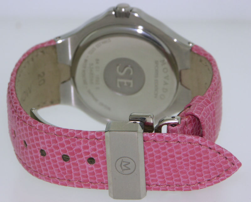 Movado ladies 32mm large case "Sports Edition" model with double row of diamonds, pink mother-of-pearl dial and pink lizard band