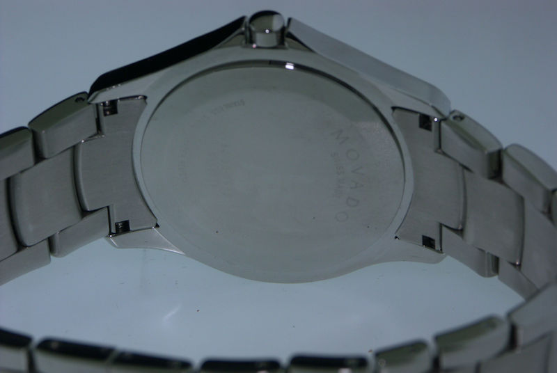 Movado Military museum dial. Combination finish stainless steel case & bracelet. Black dial with steel tone hands and dot at 12 o`clock. Swiss quartz analog movement. Sapphire crystal.