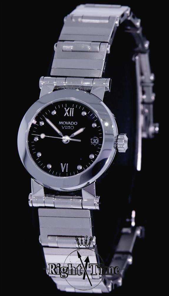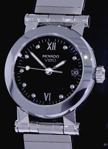 Movado Vizio Ladies Watch, all stainless steel case and band, black dial, hard metal - scratch resistant tungsten carbide bezel and sapphire crystal