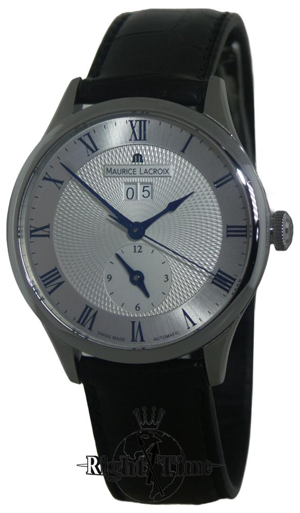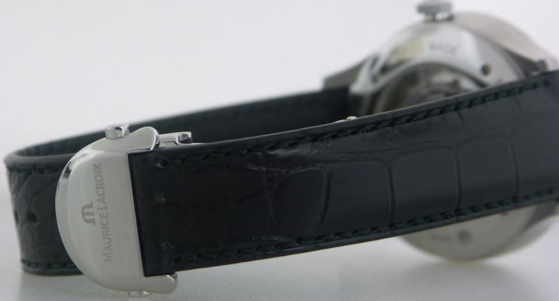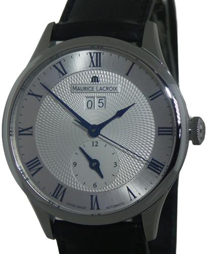 Maurice Lacroix Masterpiece collection model MP6707-SS001-110-1. Swiss made automatic movement. Silver textured dial with blued hands and Roman numerals. Solid stainless steel case with sapphire crystal. Black crocodile leather strap with deployment buckle.