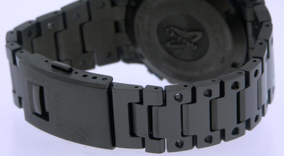 Casio G-Shock MR-G model MRG-B5000BA-1. The case and bezel are made of Ti64-based super-hard titanium alloy, while the band is made of another special titanium alloy, DAT55G, that is both three times harder than pure titanium and highly workable. The bezel top is crafted in COBARION and consists of 25 different components, a cobalt-chrome alloy four times harder than pure titanium. Solar powered. MB6 multi-band technology. Bluetooth connected. Other functions include stopwatch, alarm, timer, dual time, a built in LED. Sapphire crystal.