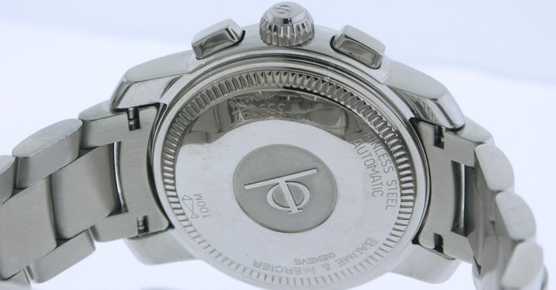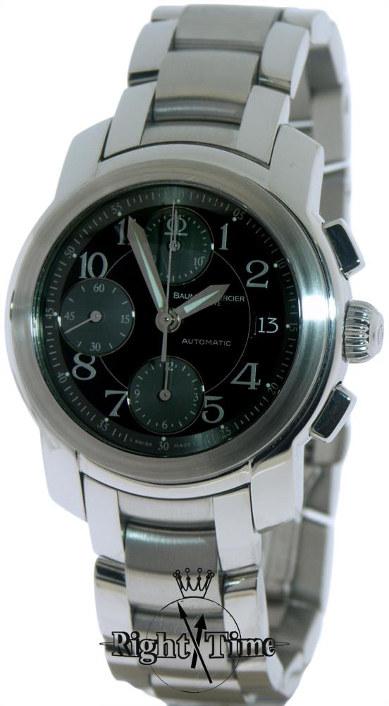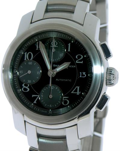 Baume & Mercier Capeland model MV045216. Swiss made automatic chronograph movement. Combination finished stainless steel case and bracelet. Black dial with grey sub dials, and oversized polished luminous filled hands. Domed sapphire crystal.