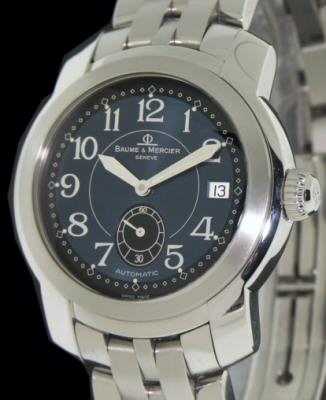 Baume & Mercier Capeland automatic with small second hand at "6", navy blue with black accent dial with applied polished markers, powered by ETA2895 self-winding movement on metal 5 link bracelet