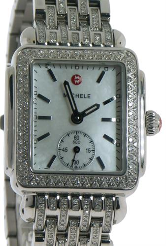 Michele Deco Diamond model MW06V01A1025. Stunning polished stainless steel case and bracelet with full diamond bezel and end links. Genuine mother-of-pearl dial with polished steel tone hands and markers. Swiss made quartz analog movement. Curved sapphire crystal.